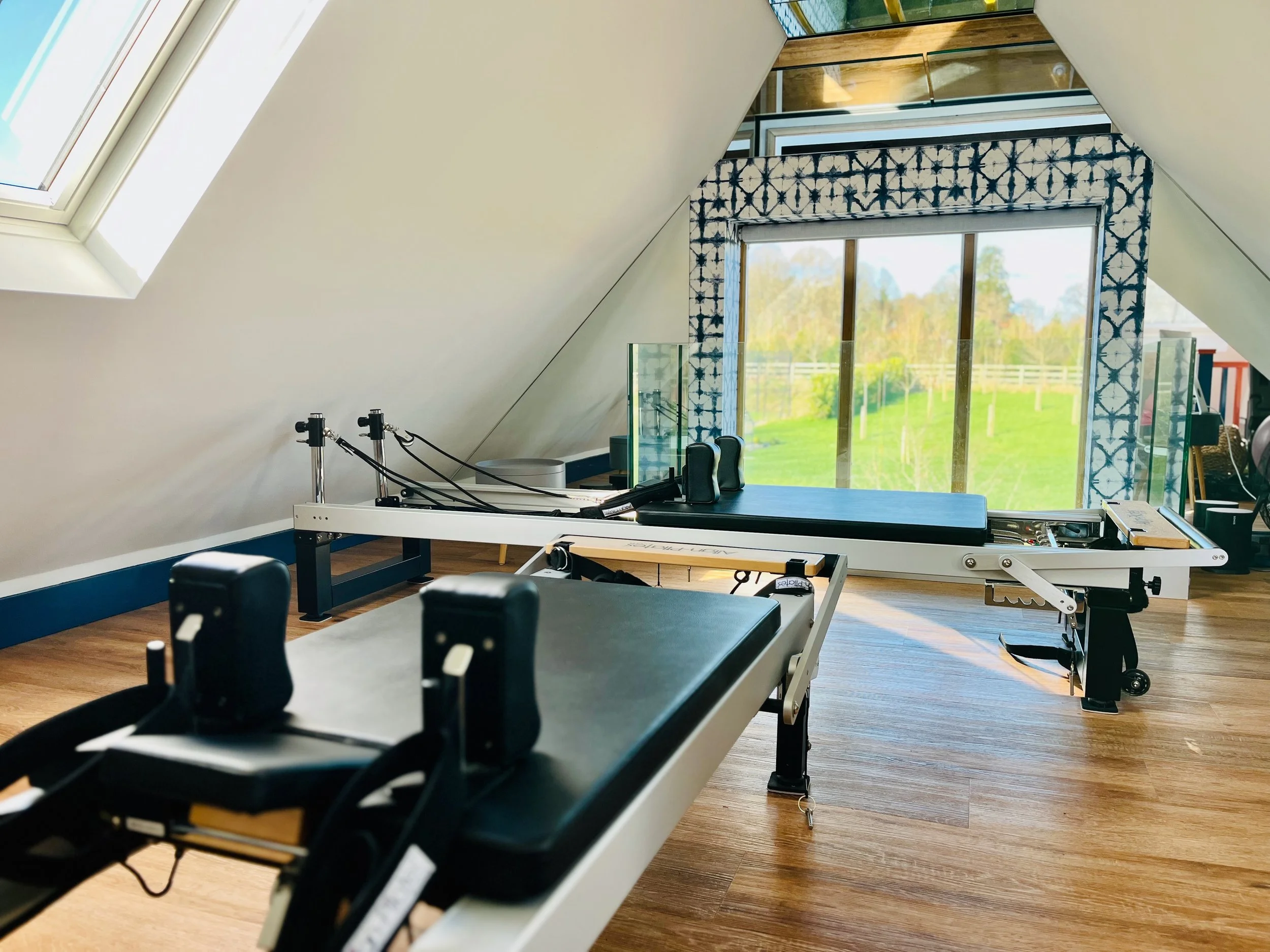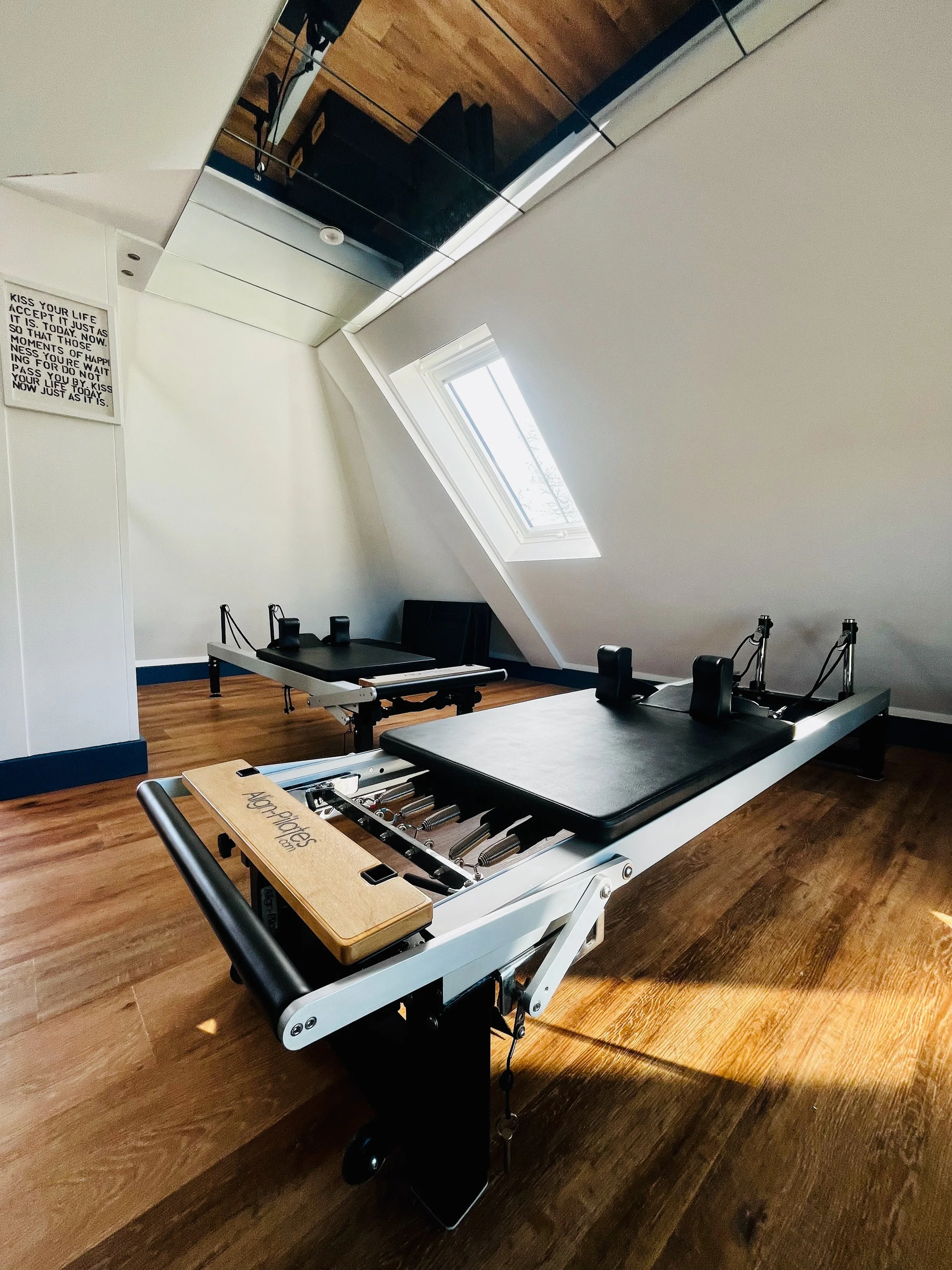 My two Pilates Reformers are located in a beautiful “loft” area upstairs. Strength and Fitness and Pilates Mat will take place in a larger open space downstairs.